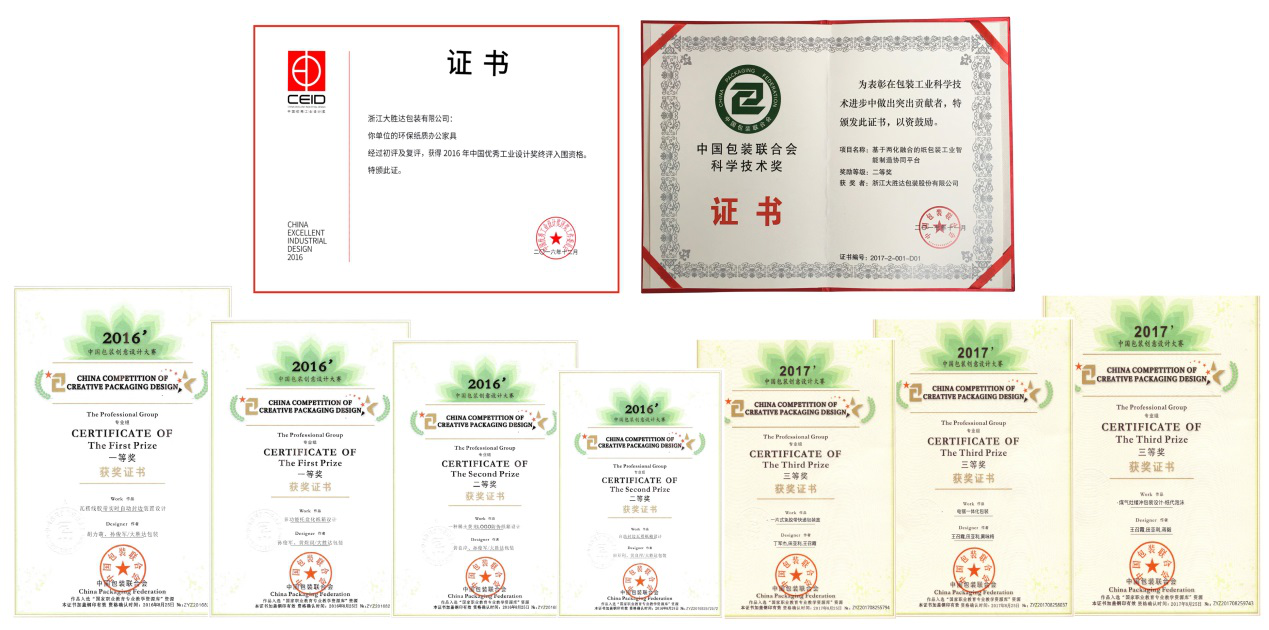 在包裝結構設計方面獲得數(shù)十項獎項,如中國包裝創(chuàng)意設計大賽一、二、三等獎,2016年中國優(yōu)秀工業(yè)設計獎終評入圍獎,中國包裝聯(lián)合會科學技術獎等
